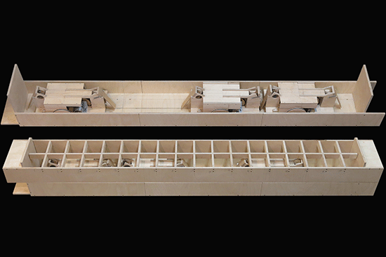 Drei baugleiche Roboter mit identischen Verhaltensprogrammen wechseln zwischen Stehen und Liegen. Auslöser ihrer Aktivität sind akustische Ereignisse und ihre innere Uhr.