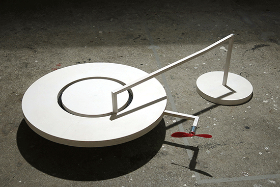 Die waagrecht gelagerte Kreisscheibe wird durch den an ihr angebrachten Arm mit Propeller in Rotation versetzt. Der auf die Kreisfläche gesetzte Arm schleift eine immer tiefere Rille in die Scheibe, was längerfristig ein Auseinanderfallen des Systems verursacht.