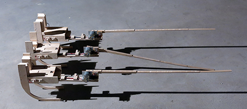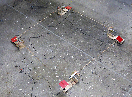 Vier feine Arme bilden ein Geviert, bei dem jeder Arm den Fuss des Nachbararmes mit der roten Fläche berührt. Dieses System zeigt gegen aussen keine Aktivität. Sobald aber ein Kontakt unterbrochen wird, startet ein nicht enden wollender Ablauf sich hebender und sich senkender Arme.