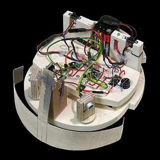 Der autonom agierende, analog gesteuerte Roboter zeigt ein lichthungriges Verhalten und wendet sich von Hindernissen ab.