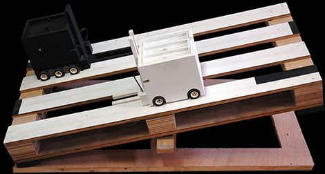 Zwei Gabelstapler zirkulieren auf der labil gelagerten Palette. Die Fahrzeuge reagieren mit der Zeit sensibel auf die Ausrichtung ihrer gemeinsamen Unterlage und es gelingt ihnen, früher oder später, eine Balance zu erreichen und zu halten. Der Zustand des Gleichgewichtes wird nach nicht genau vorhersehbarer Zeit durch erneute Aktivität eines Gabelstaplers zerstört.