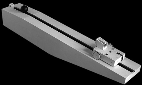Sisyphus schiebt die Kugel reflexartig die Rampe hoch und kann sie oben positionieren. Während der Rückfahrt in seine Ruheposition am unteren Ende der Rampe, bringt der Roboter das System wenig zum Kippen, was die Kugel erneut auf ihn zu rollen lässt und ihn zu neuer Arbeit zwingt.